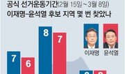 8일 서울 유세를 끝으로 더불어민주당 이재명 대선 후보와 국민의힘 윤석열 후보의 22일간 ‘유세 전쟁’도 막을 내렸다. 신종 코로나바이러스 감염증(코로나19) 확산세에도 불구하고 한 곳이라도 더 방문해 한 명의 유권자라도 더 만나려는 후보들의 노력은 대선 전날까지 이어졌다. 각 당에 따르면 22일간 이 후보와 윤 후보의 유세 횟수만 각각 80회, 96회에 달하고 이동 거리도 각각 5266km, 5954km에 이른다. ○ 李 수도권-이낙연·정세균 호남, ‘투트랙 전략’일찌감치 서울을 포함한 수도권을 이번 대선의 최대 격전지로 꼽은 이 후보는 유세 일정의 절반 이상을 이 지역에 할애했다. 전체 80회 유세 중 서울 유세 24회, 경기·인천 유세 23회로 58.5%의 유세가 수도권에서 이뤄진 것. 특히 이 후보는 이달 들어 TV토론이 열린 2일과 제주·부산 등을 찾은 7일만 빼고 나머지 엿새를 서울·인천·경기에 집중하는 수도권 총력전에 나섰다. 이 후보 측 핵심 관계자는 “박빙의 승부에서 결국 수도권 표심이 분수령이 될 것으로 보고 유세 일정을 집중했다”고 밝혔다. 이 후보가 수도권에 집중하는 동안 민주당의 안방 격인 호남은 이낙연 총괄상임선거대책위원장과 정세균 선대위 상임고문이 나섰다. 호남 출신인 두 사람은 유세 기간에 각각 5회, 6회에 걸쳐 호남을 찾았다. 이 후보는 같은 기간 두 차례 호남을 방문했고 총 6개 지역 유세에 나섰다. 당 선거대책위원회 관계자는 “호남 민심이 상당히 안정적으로 결집되고 있다는 보고가 여러 차례 있었고 제한된 기간 동안 후보는 다른 취약 지역에 집중할 필요가 있다는 판단이 반영된 결과”라고 설명했다. 다른 권역에선 충청권(대전·세종·충북·충남) 방문이 4회(유세 9회)로 가장 많았고 대구·경북 3회 방문(유세 8회), 부산·울산·경남 3회 방문(유세 6회) 순으로 나타났다. ○ 野, “텃밭서 다지고 경기 공략하는 쌍끌이 전략”윤 후보는 이번 공식 선거운동 기간에 총 96회에 이르는 유세 일정을 소화했다. 핵심 승부처인 수도권을 비롯해 강세 지역과 취약 지역을 가리지 않은 물량 공세로 유권자 표심에 호소한 것. 지역별 빈도는 수도권이 13회 방문, 유세 42회(43.8%)로 가장 많다. 이어 대구·경북 5차례 방문(유세 15회), 부산·울산·경남 5회 방문(유세 14회), 대전·세종·충청 6회 방문(유세 13회) 순이다. 윤 후보 역시 선거운동 막바지인 5∼7일 동안 서울과 경기지역을 집중적으로 공략하는 유세 일정을 택했다. 특히 경기지역의 경우 7일 구리부터 평택까지 8개 지역을 하루에 훑으며 경기도지사 출신인 이 후보의 정치적 기반 공략에 나섰다. 선거대책본부 박대출 유세본부장은 “대구·경북과 부산·울산·경남에서 확실한 우세를 확인하고 정권교체 열망을 수도권으로 전파하려는 의도였다”고 설명했다. 이번 대선에서 호남 지지율 30%를 목표로 내건 윤 후보는 호남권도 총 3회 방문해 5차례 유세를 했다. 2017년 대선 당시 자유한국당(현 국민의힘) 홍준표 후보가 단 한 차례 찾은 것과 대조적이다. 윤 후보는 전남 목포 방문길에는 배를 타고 하의도에 있는 김대중 전 대통령 생가를 방문하기도 했다. 박 본부장은 “박정희 김영삼 김대중 전 대통령 생가를 모두 방문한 것도 윤 후보의 국민통합 의지를 보여준 것”이라고 덧붙였다. 여기에 국민의힘 이준석 대표도 설날 광주 무등산 산행, 전남 도서 지역 투어 등으로 윤 후보의 호남 표심 호소를 도왔다. 권오혁 기자 hyuk@donga.com장관석 기자 jks@donga.com}