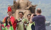 외국인 관광객들이 서울 광화문광장 세종대왕 동상 앞에서 한복을 입고 즐거운 한때를 보내고 있다. 얼마 전까지만 해도 흔히 볼 수 있는 풍경이었지만 지난달 메르스 사태 이후 한국을 찾는 외국인 관광객들의 발길이 눈에 띄게 줄었다. 홍진환 기자 jean@donga.com}
