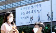 1일 마스크를 쓴 시민들이 서울 광화문 교보생명 빌딩 근처에서 이야기를 나누고 있다. 새 옷으로 갈아입은 교보생명 광화문 글판 여름편에는 백무산 시인의 시 ‘정지의 힘’ 가운데 “씨앗처럼 정지하라. 꽃은 멈춤의 힘으로 피어난다”는 구절이 담겼다. 송은석 기자 silverstone@donga.com}