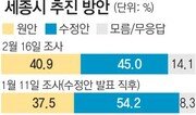 세종시를 행정중심복합도시가 아닌 교육과학중심 경제도시로 건설하겠다는 정부의 수정안이 다소 동력을 잃고 있는 것으로 나타났다. 설 연휴 직후인 16일 동아일보가 여론조사기관인 코리아리서치센터(KRC)에 의뢰해 전국의 성인 남녀 1000명(표본 수 충청 300명, 비충청 700명)을 대상으로 실시한 긴급 전화 조사 결과 수정안을 지지한다는 응답은 45.0%, 원안대로 행정중심복합도시를 건설해야 한다는 응답은 40.9%로 나타났다. 정부가 세종시 수정안을 발표한 직후인 지난달 11일 조사에서는 수정안 지지가 54.2%, 원안 지지가 37.5%였다. 원안 지지 응답이 오차 범위 내에서 약간 상승한 반면 수정안 지지 응답은 9.2%포인트 하락했다. 대전 충청의 경우 원안 지지 응답은 55.9%로 지난달 11일 조사의 53.0%와 엇비슷했으나 수정안 지지 응답은 32.7%로 지난달 11일 조사의 40.7%에서 8%포인트 줄었다. 이번 조사에선 무응답층이 14.1%로 지난달 11일 조사의 8.3%에 비해 6%포인트가량 늘어났다. 이는 과거 세종시 수정을 지지했던 이들 중 일부가 무응답층으로 이탈한 것으로 풀이된다. KRC 측은 “세종시 수정 추진을 둘러싼 정치권의 논란이 장기화하면서 이슈 피로 현상이 나타나고 있다”고 해석했다. 실제로 설 연휴를 전후해 세종시 문제에 대한 생각에 변화가 있었느냐는 물음에 85.3%가 ‘별 변화가 없다’고 답했다. 설 연휴 기간 가족 등 주위 사람들과 세종시 문제에 대해 의견을 나눴느냐는 물음에도 ‘별다른 대화를 나누지 않았다’는 답변이 70.1%였으며 ‘일부 대화를 나눴다’는 응답과 ‘많은 대화를 나눴다’는 응답은 각각 20.2%, 9.7%에 그쳤다. 세종시 해법을 묻는 질문에는 ‘국민투표로 결론을 짓는 게 낫다’는 의견이 45.9%로 절반에 육박했으며 ‘국회 표결 절차를 거쳐 결론짓는 것이 낫다’는 응답은 24.3%에 그쳤다. ‘충청도민만의 투표로 결론짓는 것이 낫다’는 답변은 6.4%였다. KRC 측은 “정치권의 문제해결 능력에 대한 불신이 반영된 결과”라고 해석했다. 한편 세종시 문제가 해결되지 않는 가장 큰 책임이 누구에게 있느냐는 물음에는 △이명박 대통령 38.3% △민주당 등 야당 19.1% △충청지역 정치인과 여론주도층 13.0% △박근혜 전 한나라당 대표 10.2% 등의 순이었다. 이번 조사의 표본 오차는 95% 신뢰구간에서 ±3.1%포인트다.정용관 기자 yongari@donga.com고기정 기자 koh@donga.com}