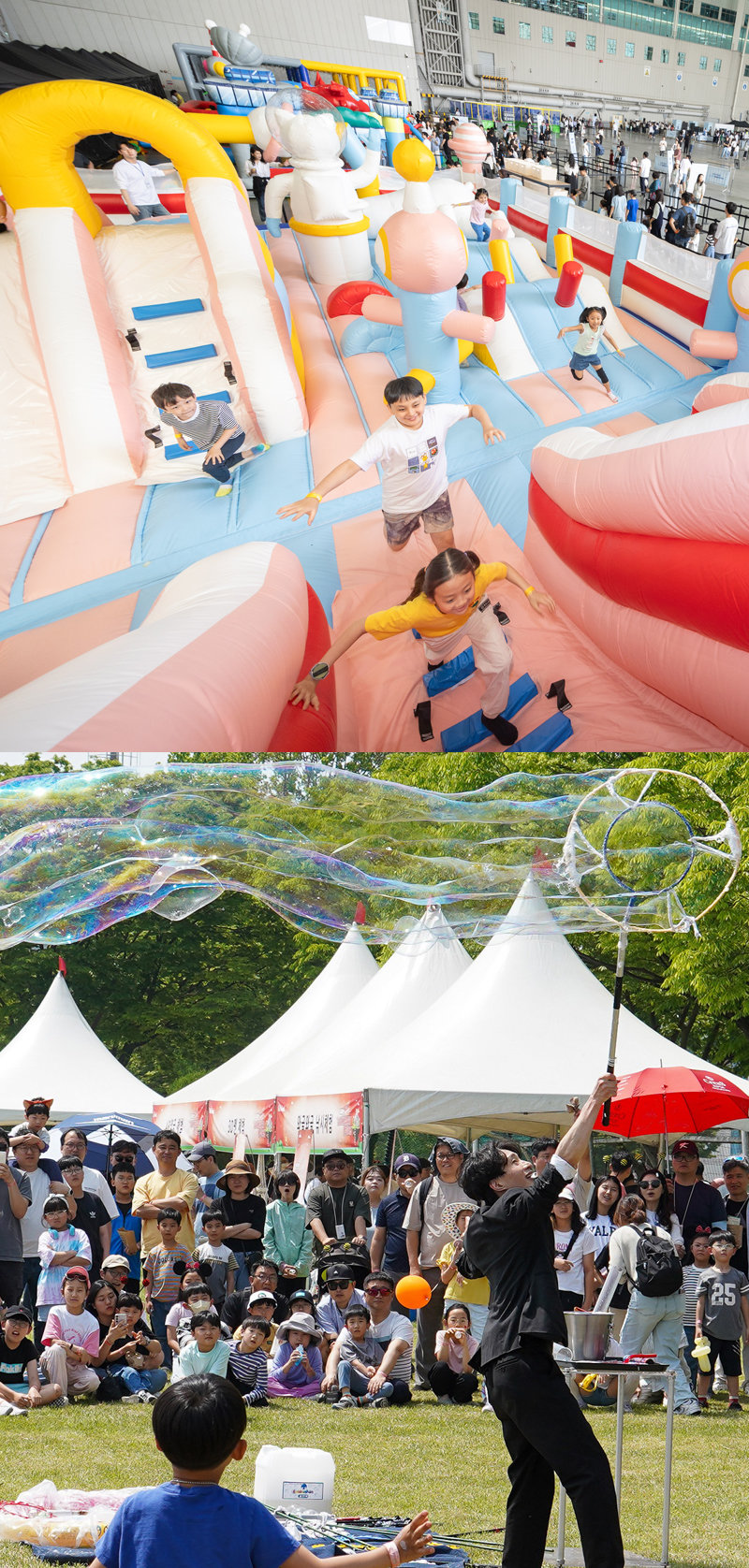 기업들이 5일 어린이날을 맞아 임직원들이 가족들과 함께 추억을 쌓는 자리를 마련했다. LG전자는 4일 경기 평택 LG디지털파크에 임직원 및 협력사 가족 1만 명을 초대했다. LG디지털파크 대운동장에는 놀이 시설인 에어바운스, 미끄럼틀 등이 마련됐고 캐리커처, 마술 공연 등 다양한 체험 프로그램들이 진행됐다. 5일에는 경남 창원 LG스마트파크에 4∼10세 자녀가 있는 임직원·협력사 가족 4000명을 초청해 환경의 중요성을 알리는 뮤지컬 공연을 열었다. 또 재활용품을 활용한 만들기 체험과 분리배출 실천 체험 코너도 운영했다. 대한항공은 4일부터 사흘간 서울 강서구 본사 격납고를 개방해 임직원 가족들을 위한 ‘패밀리데이’ 행사를 개최했다. 대한항공은 지난해보다 행사 규모를 키워 델타항공 임직원 가족 40여 명을 초대하는 등 총 1만3000명이 참여할 수 있도록 했다. 격납고는 테마파크로 탈바꿈해 어린이용 놀이기구와 드론 게임, 포토 부스, 페이스페인팅, 푸드트럭 등을 즐길 수 있도록 꾸며졌다. 현장에서는 대한항공이 최근 에어버스로부터 100번째로 도입한 최신 항공기 ‘A321 네오’ 투어도 진행했다. 티웨이항공도 4일 강서구 티웨이항공 훈련센터에서 임직원 가족들을 대상으로 ‘크루(승무원) 클래스’ 체험 프로그램을 제공했다. 참가자들은 승객 서비스부터 화재 진압, 비상 탈출, 보안 및 응급처치 실습 등 전문 훈련 교관의 지도 아래 승무원이 실제 수행하는 역할을 체험했다. KT는 서울 서초구 예술의전당에서 임직원 가족 650여 명을 초청해 ‘마음을 담은 클래식 콘서트를 진행했다. 임직원 자녀들은 버블막대 등 깜짝 선물도 받고 동화극 주인공으로 분장한 배우들과 포토타임도 가졌다.박현익 기자 beepark@donga.com}