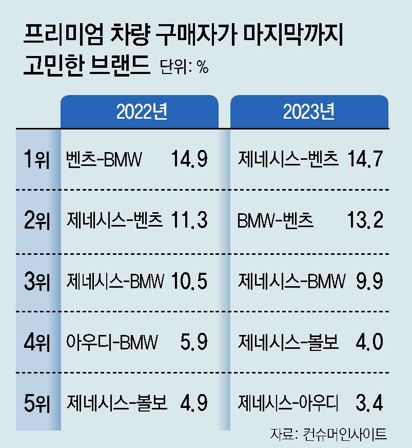 지난해 프리미엄 차량을 구매한 소비자들은 마지막까지 ‘벤츠냐 제네시스냐’를 두고 가장 많이 고민했던 것으로 조사됐다. 예전에는 ‘벤츠냐 BMW냐’를 놓고 고심하는 사례가 가장 많았다. 프리미엄 시장에서 제네시스의 존재감이 유럽차 못지않게 높아진 것이다. 7일 소비자 분석기관인 컨슈머인사이트의 ‘연례 자동차 기획조사’에 따르면 ‘프리미엄차를 구매하기 전 마지막까지 비교한 브랜드가 무엇이냐’는 질문에 응답자 중 가장 많은 14.7%가 ‘제네시스-메르세데스벤츠’를 꼽았다. 이번 조사는 2022년 7월부터 지난해 6월까지 프리미엄 차량 구매자 1375명을 대상으로 진행됐다. 조사 대상 차량은 현대자동차의 고급브랜드 제네시스, 독일 벤츠·BMW·아우디, 스웨덴 볼보, 일본 렉서스다. 직전 조사(2022년)에서 1위(14.9%)였던 ‘벤츠-BMW’는 이번 조사에서 2위(13.2%)로 밀려났다. 또 이번 조사 3∼5위가 ‘제네시스-BMW’, ‘제네시스-볼보’, ‘제네시스-아우디’ 순으로 재편되며 모두 제네시스가 포함되기도 했다. 제네시스와 다른 프리미엄차를 비교했을 때 결국 제네시스를 최종 선택하는 비율도 높았다. ‘제네시스-벤츠’ 비교 시에는 64%가 제네시스를 택했다. BMW와 비교할 때는 57%, 볼보와는 73%, 아우디와는 74%가 결국 제네시스를 선택한 것으로 조사됐다. 이 같은 변화는 판매량에서도 나타난다. 제네시스는 올해 1∼4월 국내 내수 시장에서 지난해 같은 기간(4만2973대) 대비 6.0% 늘어난 4만5554대가 팔렸다. 같은 기간 BMW(―5.2%), 벤츠(―17.6%), 볼보(―24.5%), 렉서스(―6.2%) 모두 역성장을 기록했다. 제네시스가 프리미엄 시장에서 두각을 나타내는 이유는 차량 품질과 사후 서비스(AS) 측면에서 만족도가 높기 때문이다. 제네시스 국내 소비자들이 선호하는 첨단 기능 옵션이 수입차 대비 많이 장착됐다는 평가를 받는다. 사후 서비스에서도 현대차의 네트워크를 공유하기 때문에 차량이 고장 났을 때 수입차 대비 신속하게 문제를 해결할 수 있다. 이호근 대덕대 미래자동차학과 교수는 “제네시스의 경우 BMW나 벤츠 대비 가격이 비싸지 않은데 실제 이용해보면 가격 대비 성능 만족도가 높은 편이다”라며 “현대차와 분리한 전용 전시관을 더 늘리는 등 차별화 전략을 강화한다면 더 입지를 굳힐 수 있을 것”이라고 말했다.한재희 기자 hee@donga.com}