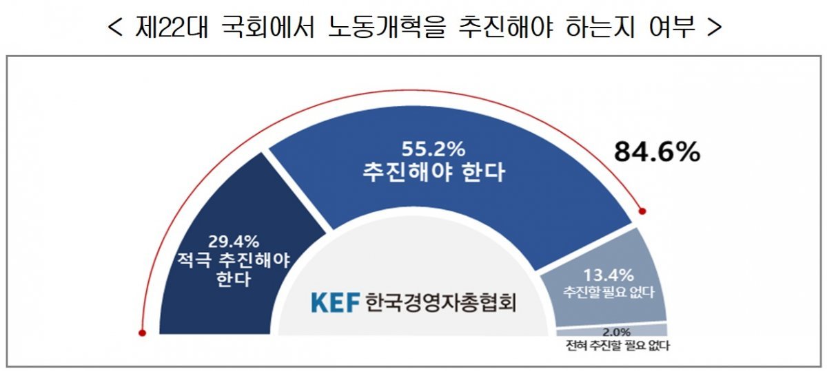 기업 10곳 중 8곳 이상이 22대 국회에서 ‘노동개혁 입법이 추진돼야 한다’는 입장을 가졌다는 조사 결과가 나왔다.한국경영자총협회(경총)는 3월 26일~4월 5일 국내 기업 200곳을 대상으로 ‘22대 국회에 바라는 고용노동 입법 설문조사’를 실시한 결과 84.6%가 ‘노동개혁 입법을 추진해야 한다’고 답했다고 8일 밝혔다. 노동개혁 입법을 추진해야 한다는 응답한 기업 중 58.8%은 입법 시기와 관련해 ‘국회 구성 후 점진적으로 추진하되 연내 마무리해야 한다’고 답했다. 또한 노동시장 유연성 제고를 위해 우선 추진해야 할 입법 과제로 ‘근로 시간 운영의 유연성 확대’를 꼽은 기업이 55.9%로 가장 많았다. 반면 입법을 추진하면 노동시장 및 노사관계에 악영향을 줄 것으로 우려되는 입법으로는 ‘주 4일제 또는 주 4.5일제’(34.3%), ‘노란봉투법’(20.4%), ‘정년연장’(20.4%) 등이 꼽혔다.한재희 기자 hee@donga.com}