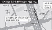 경기 이천에서 9일 야간에 국토 종단 울트라마라톤을 뛰던 남성 3명이 만취한 운전자가 몰던 차량에 치여 목숨을 잃었다. 시속 100㎞로 달린 것으로 추정되는 음주 차량은 차도 위를 이동하던 마라토너들을 뒤에서 들이받았다. 경찰은 마라톤 주최 측이 안전 관리에 소홀했는지도 함께 살펴보고 있다. 경기 이천경찰서는 “이날 오전 3시 30분경 이천시 신둔면 수광리 신둔파출소 인근 경충대로 편도2차선 도로에서 A 씨(30)가 경기 광주 방면으로 몰고 가던 차량이 마라톤대회 참가자들인 전모 씨(59)와 백모 씨(65), 손모 씨(61)를 추돌했다”고 밝혔다. 이들은 인근 병원으로 옮겨졌으나 모두 숨을 거뒀다. 경찰 조사 결과 A 씨의 혈중알코올농도 수치는 운전면허 취소 수준이었다. A 씨는 사고지점에서 약 3㎞ 떨어진 이천 시내에서 지인들과 술을 마신 뒤 운전대를 잡은 것으로 알려졌다. A 씨는 경찰 조사에서 “앞에 사람이 있는지 알지 못했다”고 진술했다. 경찰은 현재 A 씨를 교통사고처리 특례법 위반 혐의로 형사 입건해 조사하고 있으며, 조만간 구속영장을 신청할 방침이다. 경찰 관계자는 “A 씨의 진술과 주변 폐쇄회로(CC)TV 등 종합적으로 확인하고 있다”고 설명했다. 전 씨 등은 5일부터 열린 ‘2020 대한민국 종단 537㎞ 울트라 마라톤 대회’에 참가한 마라토너들이었다. 주최 기관은 대한울트라마라톤연맹이다. 경찰 측은 “부산 태종대에서 출발해 파주 임진각까지 가는 코스였다고 한다”며 “참가자들은 10일 오후 1시쯤 임진각 종점에 도착할 계획”이라 전했다. 참가자 75명 가운데 중간 그룹이었던 이들은 등에 짊어진 배낭에 20㎝ 정도 되는 막대 모양의 유도등을 매달고 있었다. 경찰에 따르면 이 대회는 50㎞마다 설치된 체크포인트에서 안전장비 등을 점검하고 휴식을 취한 뒤 다시 달리는 방식으로 진행됐다. 사고가 난 지점은 코스 상 400㎞ 체크포인트인 소정 사거리에서 500m가량 떨어져 있다. 대회 참가자들은 오전 3시 반경까지 이 체크포인트에서 휴식을 취하다가 출발한 것으로 알려졌다. 사고를 당한 마라토너들은 2차로인 사고지점에서 인도 쪽 차로를 횡대로 나란히 걷고 있었다고 한다. 대회 운영규정에 따르면 마라톤 참가자들은 기본적으로 인도로 달려야 하지만 인도가 없는 상황에서는 차도 가장자리에서 달리게 돼 있다. 경찰 관계자는 “인도가 아닌 곳으로 갈 때는 주최 측에서 참가자들 뒤편에서 차량 등을 동원해 안전조치를 해줘야 하는데 그런 조치가 없었다”고 했다. 연맹 관계자는 “마라톤 전체 코스에 참가자 보호용 차량 5대가 배치됐는데, 사고 당시 피해자들 근처에 차량이 없었다”고 했다. 경찰은 연맹 측도 안전 과실이 있는지 살펴보고 있다. 사고 당시 주변에는 가로등이 있긴 했지만 매우 어두웠으며, 3명 외에는 다른 참가자나 행인은 없었던 것으로 전해졌다. 사고도 인근을 지나던 다른 차량의 운전자가 119에 3시 34분경 신고했다. 연맹 관계자는 “대회 도중 갑작스러운 사고로 참가자들이 사망해 매우 안타깝다”며 “경찰이 사고 경위를 조사 중인 만큼 최대한 협조하겠다”고 했다. 2008년 ‘한반도횡단 울트라 마라톤’에서도 참가자가 중앙선을 넘어 맞은편에서 온 승용차와 부딪혀 숨지는 사고가 있었다. 김소영기자 ksy@donga.com이천=김태성기자 kts5710@donga.com이경진기자 lkj@donga.com}