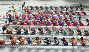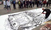 달마도의 대가 법용 스님이 14일 부산 영도구 영도다리축제장에서 남북통일을 기원하는 가로 10m, 세로 2m의 대형 달마도를 그리고 있다. 박경모 기자 momo@donga.com}