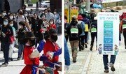 정부가 사회적 거리 두기를 완화한 뒤 처음 맞은 주말인 26일 오후 서울 종로구 경복궁에서 마스크를 쓴 방문객들이 공연을 보고 있다(왼쪽 사진). 전날인 25일 은평구 북한산성탐방지원센터 앞에서 국립공원공단 직원과 산악회 회원들이 ‘탐방 거리 두기’를 알리는 홍보물을 가방 등에 부착하고 발걸음을 옮기고 있다. 송은석 silverstone@donga.com·최혁중 기자}