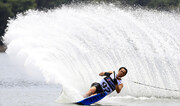 16일 전남 영광군 불갑저수지에서 제32회 전국남녀학생종별 수상스키, 웨이크보드 선수권대회가 열렸다. 대회 참가 선수가 커다란 물보라를 일으키며 물살을 가르고 있다. 박영철 기자 skyblue@donga.com}