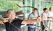 23일 전남 화순군 화순읍의 전통 국궁 연습장인 서양정에서 평균 연령 70세가 넘는 국궁 동호인들이 무더위 속에서 활시위를 당기고 있다. 박영철 기자 skyblue@donga.com}