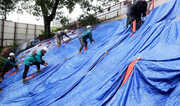 장마가 시작된 26일 광주시 북구 연제동이 한 공사현장에서 작업자들이 붕괴위험이 있는 옹벽에서 비닐덮개를 씌우며 폭우피해를 대비하고 있다.광주=박영철 기자 skyblue@donga.com}