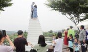 전남 곡성군 겸면 백련저수지 옆에 있는 나무계단이 최근 소셜네트워크서비스(SNS) 등을 통해 알려지면서 관광객들의 발길이 이어지고 있다. ‘천국의 계단’으로 불리는 이 계단은 인근의 카페가 3월에 설치한 이후 지역 명소로 자리를 잡았다. 박영철 기자 skyblue@donga.com}