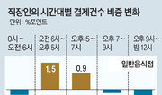 5년차 대기업 직원인 장모 씨(33)는 지난해부터 부인과 장을 보고 함께 저녁 먹는 시간이 늘었다. 주52시간 근무제 시행으로 일찍 퇴근하는데다 회식자리는 줄었기 때문이다. 회식을 하더라도 1차에서 끝나는 경우가 대부분이다. 예전보다 퇴근시간이 한 시간 이상 앞당겨지면서 책 볼 시간이 많아져 서점에 가는 횟수도 늘었다. 장 씨는 “주52시간 근무제가 시작되면서 일주일에 한 번 하던 회식이 한 달에 한두 번으로 줄었다”라며 “회식을 하더라도 보통 고깃집 같은 데서 1차만 하고 끝난다”라고 말했다. 주52시간 근무제가 직장인들의 소비 생활을 바꾸고 있다. 퇴근 후 시간에 여유가 생기자 편의점이나 백화점 같은 곳에서 돈을 쓰는 시간대도 예전보다 빨라졌다. 동아일보가 삼성카드와 함께 2017년과 올해 직장인들의 카드 사용내역을 비교해봤다. 일반음식점과 카페, 편의점, 백화점, 사우나 등 워라밸(일관 삶의 균형) 관련 5대 업종을 분석한 결과 최근 2년 간 직장인의 카드 사용 행태에 유의미한 변화가 관찰됐다.●오후 5~9시 결제는 늘고, 9시 이후 결제는 줄고 직장에 다니는 삼성카드 고객들은 전반적으로 오후 7시 전후에 소비가 늘어난 반면 오후 9시 이후에는 카드 결제의 빈도가 줄었다. 일반음식점의 경우 오후 5시부터 7시 사이 결제건수는 2017년에는 전체의 11.3%였지만 2019년에는 12.2%로 0.9%포인트 늘었다. 그러나 오후 9시 이후 음식점 결제는 같은 기간 전체의 15.9%에서 14.0%로 1.9%포인트나 감소했다. 카페도 오후 5~9시 사이 결제건수 비중은 0.7%포인트 늘었지만, 오후 9시 이후부터 자정 사이에는 1.6%포인트 줄었다. 음식점과 카페의 오후 9시 이후 카드 결제 비중은 여성보다 남성이 더 빠르게 줄어든 것으로 나타났다. 여성 고객은 두 곳에서 1.4%포인트씩 결제건수 비중이 감소했지만, 남성고객의 경우 각각 이보다 많은 2.2%포인트, 1.8%포인트가 줄었다. 주52시간 근무제가 상대적으로 남성 직장인의 귀가 시간을 당기는 데 더 많은 영향을 미친 것으로 풀이된다. 편의점과 백화점에서의 소비시간대도 빨라진 것으로 나타났다. 편의점에서는 오후 5~9시 사이 결제 비중이 1.0%포인트 증가했고, 백화점에서는 0.7%포인트 늘었다. 그러나 오후 9시 이후에는 두 업종 다 각각 1.3%포인트, 0.1%포인트 줄어들었다. 사우나의 경우 오후 5시부터 7시 사이 결제건수 비중이 0.7%포인트 늘었지만, 오후 7시 이후로는 2.0%포인트 떨어졌다.●외식→취미로 소비패턴 변화 퇴근이 빨라지면서 취미생활을 위해 돈을 아끼지 않는 직장인들은 늘고 있다. 2년차 직장인 황모 씨(31)는 얼마 전부터 퇴근 후에 스쿼시 강습을 받고 있다. 주52시간 근무제 이후 오후 8시 전후였던 퇴근시간대가 6~7시로 당겨졌기 때문이다. 입사 후 5kg이 찐 황 씨는 다이어트를 위해 스쿼시를 선택했다. 황 씨는 “예전에는 일이 끝나면 쉬기 바빴는데 이제 운동을 할 수 있으니까 재밌고 신기하다”라고 말했다. 직장인의 회식이 줄어들면서 울상이 된 외식 업체들은 이들의 달라진 소비패턴에 적응하기 위해 애쓰는 중이다. 최승재 소상공인연합회장은 “전체적으로 사람들의 소비가 외식업에서 여가 관련 업종으로 이동하고 있다”며 “식당들은 직장 회식이나 모임보다는 가족이나 친구, 연인 단위 손님들을 잡기 위해 노력하고 있다”고 말했다. 남건우 기자 woo@donga.com}