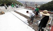 ‘한일 청년 공공예술프로젝트 쿨루프 사업’에 참가한 한국과 일본의 청년들이 12일 부산 동구 초량동의 한 가옥 지붕에 흰색 페인트칠을 하고 있다. 지붕에 햇빛 반사용 페인트를 칠하면 집안 온도를 5도 정도 낮춰주는 효과가 있다. 박경모 기자 momo@donga.com}