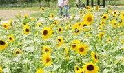 15일 부산 강서구 대저생태공원을 찾은 관광객들이 활짝 핀 해바라기밭을 산책하고 있다. 박경모 기자 momo@donga.com}