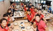 말복인 16일 부산 해운대해수욕장 119 수상구조대원들이 점심으로 삼계탕을 먹고 있다. 해운대소방서 의용소방대원들이 기록적인 폭염 속에서 해운대해수욕장 피서객 안전을 지키기 위해 구슬땀을 흘린 119 대원들을 위해 삼계탕 170그릇을 직접 조리해 제공했다. 박경모 기자 momo@donga.com}