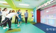 28일 부산 해운대구 운송초등학교 가상현실(VR) 스포츠실 개관식에서 학생들이 퀴즈의 정답 번호에 공을 던져 맞히는 시범을 보이고 있다. 가상현실 스포츠실은 학생들이 실내에서 공을 차거나 던져 벽에 설치된 스크린의 목표물을 맞히면 센서가 움직임을 감지해 점수를 알려주는 등 가상현실과 센서 기술을 체육활동에 적용한 시스템이다. 박경모 기자 momo@donga.com}