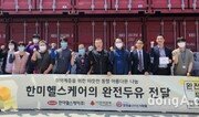 한미약품 계열사 한미헬스케어가 신종 코로나바이러스감염증(코로나19) 장기화로 균형 잡힌 영양 섭취에 어려움을 겪고 있는 취약계층 어린이 돕기에 나섰다.한미헬스케어는 지난 25일과 26일 이틀에 걸쳐 최근 새롭게 출시한 ‘완전두유’ 등 두유 제품 15만6000팩을 불우 어린이 지원단체 세 곳에 전달했다고 28일 밝혔다. 이달 초 대한적십자사에 두유 20만 팩을 전달한 데 이어 최근 한 달 동안 두유 35만6000팩을 기부한 것이다.이번에 지원한 두유는 희망친구기아대책(6만 팩)과 초록우산어린이재단(3만 팩), 희망을나누는사람들(6만 팩) 등 지원단체 3곳에 사랑의열매 사회복지공동모금회를 통해 전달됐다. 전달된 두유는 전국 46개 홈스쿨 어린이 1400여명과 중증장애영유아 치료보호시설인 한사랑장애영아원 아동 415명, 전국 아동시설(한 부모 자녀, 다문화 가정 포함) 3500명 등에게 보내진다.한미헬스케어는 어린이단체 지원에 더해 불균형한 식사 등으로 어려움을 겪는 독거노인 및 조손 가정 등 도움이 필요한 곳에 순차적으로 지원하는 ‘이웃돕기 릴레이 기부’를 지속해 나간다는 계획이다.한미헬스케어 관계자는 “코로나19 장기화로 복지 사각지대에 놓인 아이들의 균형 잡힌 영양섭취가 어렵다는 소식을 듣게 돼 두유 추가 기부를 결정했다”며 “일회성 기부로 끝내지 않고 아이들이 건강하고 밝게 성장해 나갈 수 있도록 지속적인 지원을 이어갈 것”이라고 말했다. 동아닷컴 김민범 기자 mbkim@donga.com}