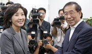 박원순 서울시장(새정치민주연합·오른쪽)이 1일 서울 중구 서울시청 시장 집무실에서 새누리당 서울시당위원장 자격으로 방문한 나경원 의원과 악수하며 웃고 있다. 둘의 만남은 2011년 서울시장 보궐선거 이후 약 3년 만이다. 홍진환 기자 jean@donga.com}
