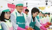 김정태 하나금융그룹 회장(왼쪽에서 두 번째)과 임직원들이 11일 서울 중구 을지로2가 외환은행 본점 앞에서 ‘사랑의 김장 나누기’ 행사에 참가해 김장을 담그고 있다. 이날 행사는 내년 1월 11일까지 두 달간 하나금융의 전 계열사가 참여하는 봉사활동인 ‘모두하나데이’ 캠페인의 일환으로 실시됐다. 하나금융은 2011년부터 매년 ‘1(하나)’이 겹치는 11월 11일을 ‘모두하나데이’로 정해 사회봉사 활동을 해 왔다. 홍진환 기자 jean@donga.com}