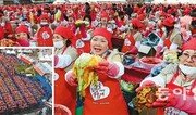 한국의 고유문화이자 유네스코 인류무형문화유산인 김장문화를 소재로 한 ‘2014 서울김장문화제’에 참여한 한국야쿠르트 직원들과 시민봉사단 등이 김장을 담그며 김치를 들어 보이고 있다. 이번 행사에서는 외국인 관광객 3000명을 포함해 9000여 명이 265t(13만 포기)이라는 사상 최대 규모의 김장을 담가 어려운 이웃들과 나눈다(큰 사진). 김치 담그기에 참여한 자원봉사자들이 하트 모양으로 서 있다(왼쪽 작은 사진). 전영한 scoopjyh@donga.com·홍진환 기자}