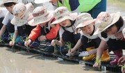 30일 부산 정관읍 예림리 고래들에서 열린 농경문화 복원체험 행사에 참여한 어린이들이 전통 손 모내기를 하고 있다. 이 행사는 전통 손 모내기 농경문화를 그대로 재현해 고향에 대한 향수가 그리운 세대와 농경문화를 처음 접하는 세대가 한데 어울리는 자리가 됐다. 박경모 기자 momo@donga.com}