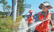 부산 경남지역에 14일째 폭염이 이어지고 있는 가운데 25일 부산 강서구청 직원들이 강서구 대저동 공항로 가로변 화단에 물을 뿌리고 있다. 박경모 기자 momo@donga.com}