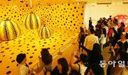 “엄마, 이게 뭐야? 샛노란 게 꼭 호박처럼 생겼어.” “응, 맞아. 이 작가 할머니가 넉넉하고 수수한 호박을 무척 좋아한대.” 6일 오후 서울 서초구 예술의전당 한가람미술관. 4일부터 열린 일본 현대예술의 거장 쿠사마 야요이(85)의 개인전 ‘쿠사마 야요이―A Dream that I dreamed(내가 꿈꾸는 꿈)’는 연휴 끝자락임에도 왁자지껄 북적였다. 오전에는 노부부나 젊은 커플이 많아 차분한 분위기였지만, 점심시간이 지나자 자녀를 동반한 가족 관람객이 부쩍 늘었다. 아이 옆에서 눈높이를 맞춰가며 얘기하거나 함께 사진을 찍는 모습이 곳곳에서 펼쳐졌다. 개막 사흘째인 이 전시는 연휴 동안 매일 2500명 이상 몰렸다. 쿠사마 특유의 화려한 물방울무늬 작품 앞엔 알록달록한 색감 때문인지 어린이 관객들이 많았다. 가이드북을 보며 유치원생 아들에게 작품 설명을 해 주던 박수경 씨(38)는 “이 전시는 왠지 몽환적이면서도 아이가 어려워하지 않아서 좋다”며 “누구나 마음대로 볼 수 있으면서도 마음이 따뜻해지는 독특함이 있는 것 같다”고 말했다. 실제로 쿠사마의 작품들은 강렬한 치유의 에너지를 관객에게 전달하는 데 가장 중점을 뒀다. 어린 시절 편집적 강박증을 앓은 작가는 정신병원 신세까지 지며 힘겨운 시기를 보냈다. 그에게 예술은 삶을 달래주는 치료제이자 거친 세상을 헤쳐 나가는 나침반이었다. 평소 사회문제에 관심이 많아 전시를 앞두고 한국의 세월호 참사 소식을 듣고 무척 안타까워했다고 한다. 개막 직전 축하연도 취소하고 “조심스럽지만 내가 작품 활동으로 위로받았듯 다만 몇 명이라도 아픔을 다독이는 시간이 됐으면 좋겠다”는 메시지를 전하기도 했다. 1층에서 3층까지 설치미술과 회화 조각 영상을 포함해 120여 점을 소개한 전시는 층마다 다른 분위기를 풍겼다. 커다란 호박 3점이 함께 모인 대표작 ‘Pumpkin, Pumpkin, Great Gigantic Pumpkin’이나 관객이 가장 사진을 많이 찍는 ‘With All My Love for the Tulips, I Pray Forever’가 있는 1, 2층은 화려한 미감에 어린이와 청소년이 놀이터라도 온 듯 신나하는 모습이 눈에 띄었다. 흑백 실크스크린으로 만든 50개의 회화작품 ‘Love Forever’나 2009년부터 시작했다는 회화 시리즈 ‘My Eternal Soul Paintings’는 매우 시적이고 은은한 분위기를 풍겨 작품 앞에 머무는 30, 40대가 많았다. 관람객 고성우 씨(42)는 “실크스크린 회화 가운데 ‘1000개의 눈’이란 작품이 맘에 들었다”며 “작가의 아픈 내면을 들여다보는 느낌”이라고 말했다. 3층 ‘Obliteration Room(소멸의 방)’은 공간 전체가 하나의 작품이다. 신발을 벗고 들어가 물방울무늬 스티커를 붙이도록 돼 있다. 고요한 흰색 방이던 작품이 관객의 참여로 원래 모습이 소멸한다는 의미다. 팁 한 가지. 에스컬레이터를 타고 3층에 내리자마자 오른쪽 창밖으로 보이는 풍경을 놓치지 말 것. 1966년 베니스비엔날레 야외에서 처음 선보인 설치 작품 ‘Narcissus Garden’과 함께 펼쳐진 근사한 전경을 카메라에 담는 이들이 많다. 6월 15일까지. 6000∼1만5000원. 02-580-1300정양환 기자 ray@donga.com}