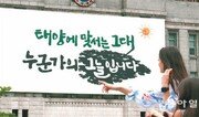 27일 오전 서울도서관(옛 서울시청사) 정문 위에 ‘태양에 맞서는 그대 누군가의 그늘입니다’라는 문구가 내걸렸다. 서울시가 ‘서울꿈새김판’이라고 명명한 이 공간을 채울 글귀를 공모한 결과 접수된 1086건 중 윤하은 씨의 글이 선정됐다.양회성 기자 yohan@donga.com}