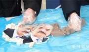 13일 서울 종로구 KT광화문빌딩 앞에서 친북 성향 단체인 국민주권연대와 청년당이 해리 해리스 주한 미국대사의 얼굴 사진 위에 두부와 도토리묵을 올린 뒤 주먹으로 으깨고 있다. 이 단체는 경찰의 제지로 해리스 대사의 참수 퍼포먼스는 진행하지 않았다. 김재명 기자 base@donga.com}
