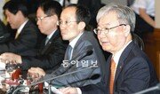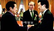 홍준표 한나라당 대표(왼쪽)와 손학규 민주당 대표가 17일 서울 여의도 국회의사당에서 열린 제63회 제헌절 경축식에 참가하기에 앞서 악수를 하고 있다. 이용훈 대법원장(가운데)이 이들을 보며 웃고 있다. 변영욱 기자 cut@donga.com}