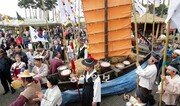 4일 서울 마포구 상암동 월드컵공원 평화의 광장에서 마포구와 마포문화원이 주최하는 ‘제4회 한강 마포나루 새우젓 축제’가 막을 올렸다. 이날 오전 행사 참가자들이 새우젓을 가득 실은 황포돛배 행렬을 재현하고 있다. 이번 축제는 6일까지 열린다. 변영욱 기자 cut@donga.com}