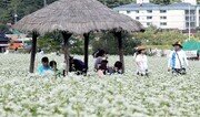 강원 평창군 봉평면에 메밀꽃이 흐드러지게 피었다. 14일 ‘메밀꽃 축제’에 참가한 가족들이 원두막 아래 앉아 만개한 메밀꽃 밭 경치를 바라보며 가을 정취를 만끽하고 있다. 평창=홍진환 기자 jean@donga.com}