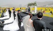 15일 부산 강서구 대저생태공원에서 개막한 제7회 부산낙동강 유채꽃축제장에서 유채꽃을 배경으로 합동 결혼식이 열리고 있다. 22일까지 열리는 이번 축제에서는 단일 면적으로는 국내최대 규모인 76만 ㎡(축구장 100개 크기)의 유채꽃밭을 즐길 수 있다. 박경모 기자 momo@donga.com}