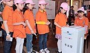 ‘내 투표용지는 투표함에 잘 들어갔을까?’ 29일 부산 해운대구의 한 쇼핑몰에서 열린 ‘어린이 선거교실’에 참여한 한 어린이가 투표함을 빤히 바라보고 있다. 중앙선거관리위원회가 6·13지방선거를 앞두고 마련한 이날 프로그램에 참여한 어린이들은 모의 투표 체험은 물론이고 투표함 관리 등 선거관리위원 체험을 하기도 했다. 부산=박경모 기자 momo@donga.com}