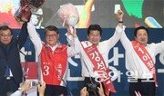폭염보다 더 뜨거웠다. 31일 새누리당 8·9전당대회 첫 합동연설회가 열린 경남 창원시 창원실내체육관은 당 대표 후보 5명을 비롯해 일반·청년 최고위원 후보 등 총 16명이 쏟아낸 열변으로 달아올랐다. 친박(친박근혜)-비박(비박근혜)계 주자들은 초반 기선을 잡기 위해 서로를 겨냥한 연설로 날선 신경전을 벌였다. 전국 각지에서 모여든 당원과 지지자 5000여 명의 응원전도 열기를 더했다. 비박계 정병국 의원은 미리 준비한 원고 대신 즉흥 연설로 “우리가 하나 돼 만든 박근혜 대통령을 (친박계가) ‘친박, 진박 대통령’으로 옹색하게 만들었다”며 “이제 친박의 역할은 끝났다”고 날을 세웠다. 주호영 의원도 “이 정부의 소통 책임자였던 이정현 의원이 (불통 지적에) 책임이 크다” “세월호 사건을 책임져야 할 장관은 누군가”라며 친박계 이정현 의원과 박근혜 정부에서 해양수산부 장관을 지낸 이주영 의원을 정조준했다. 반면 이주영 의원은 정병국-김용태 의원의 단일화에 대해 “계파 패권주의에 기댄 비박 단일화라는 유령이 지금도 떠돌고 있다”며 “이게 바로 민심에 역행하는 반역죄”라고 맞섰다. 이정현 의원은 “호남 출신인 내가 대표가 되면 영남당이 아니라 전국당이 되는 것”이라며 ‘호남 출신 당 대표론’을 강조했다. 또 최근 진행하는 ‘배낭투어’ 차림으로 단상에 올라 잠바를 벗어 흔들며 “당 대표가 되면 이 잠바가 새누리당의 유니폼이 될 것”이라고 말했다. 범친박계인 한선교 의원은 “내년 대선에서 만약 정권 재창출을 하지 못하면 자유 대한민국은 사라진다”며 “저를 당 대표로 뽑아주시면 전당대회 당일이라도 경북 성주에 내려가 주민들의 얘기를 밤새워 듣겠다”고 말했다. 영남권에서 첫 합동연설회가 열리면서 현장에는 PK(부산경남), TK(대구경북) 출신 후보 간 세 대결이 팽팽했다. PK 출신 이주영(경남 창원 마산합포), TK 출신 주호영 의원(대구 수성을)의 지지자들은 단체 티셔츠를 맞춰 입고 현수막과 함께 구호를 외치며 분위기를 끌어올렸다. 후보들은 자신의 이름과 기호가 새겨진 부채를 제작해 현장에서 나눠 주는가 하면 사물놀이패를 앞세운 치열한 장외 싸움도 벌였다. 다만 수도권 출신인 정병국 한선교 의원과 호남 출신인 이정현 의원은 지지자 수십 명만 현장을 찾아 대조적이었다. 연설회 직전 창원실내체육관 앞 8차선 도로 중 2개 차로는 관광버스 수십 대로 메워지기도 했다. 한 당직자는 “상대 후보를 비방하는 모습은 없었지만 여전히 조직적으로 당원을 동원하는 구태는 반복되는 것 같다”고 지적했다. 전당대회의 남은 변수는 비박 진영의 추가 후보 단일화 여부와 당 주류인 친박계 표심의 향배다. 비박 진영에서는 후보 등록 직전 정 의원과 김용태 의원 간 1차 단일화에 이어 정, 주 의원 간 2차 단일화 가능성이 나오고 있다. 두 의원 간 단일화가 성사될 경우 전당대회는 현재의 ‘5파전’ 구도에서 ‘비박 한 명 대 범친박 3명’의 구도로 재편된다. 당 주류인 친박계가 어떤 후보를 ‘대표 주자’로 지지할지도 관전 포인트다. 공개적인 지지 선언을 하지 않더라도 친박 주류가 이주영, 이정현 의원 등 범친박 진영 후보 당선을 위한 행보에 나설 수 있다는 관측이 많다. 한 친박계 의원은 “선거가 진행되는 과정을 좀 더 지켜보고 두 후보 가운데 당선 가능성 등을 감안해 결정할 것”이라고 말했다. 창원=강경석 coolup@donga.com / 홍수영 기자}