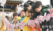 어른이나 어린이나 신년을 맞을 때면 각자 희망과 바람을 갖기 마련이다. 1일 오후 서울 중구 남산골한옥마을을 찾은 시민과 어린이들이 2014년 새해 소망을 종이 리본에 담아 줄에 매달고 있다. 홍진환 기자 jean@donga.com}