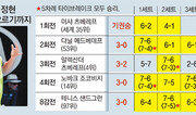 정현(22·한국체대)이 한국 테니스 선수로는 사상 처음으로 메이저 대회 8강에 진출했다. 그것도 지난 수년간 코트를 지배했던 노바크 조코비치(31·세르비아)를 꺾고 한국 테니스 역사를 다시 썼다. 세계 랭킹 58위 정현은 22일 호주 멜버른에서 열린 호주오픈 남자 단식 16강전에서 전 세계 1위 조코비치(세계 14위)를 3시간 21분 만에 3-0(7-6, 7-5, 7-6)으로 누르는 대회 최대 이변을 일으켰다. 이로써 정현은 한국 테니스 선수로는 그 누구도 가본 적이 없는 메이저 대회 8강 무대를 밟게 됐다. 정현에 앞서 한국 선수는 1981년 US오픈 이덕희(여자단식), 2000년과 2007년 US오픈 이형택이 16강까지 올랐을 뿐이다. 정현은 2016년 이 대회에서 당시 세계 1위 조코비치를 1회전에서 만나 1시간 55분 만에 0-3(3-6, 2-6, 4-6)으로 당한 완패를 후련하게 설욕했다. 무결점 그라운드 스트로크를 앞세운 정현의 끈질긴 수비 앞에 호주오픈 6회 정상을 포함해 메이저 대회 12회 우승에 빛나는 조코비치는 실수를 쏟아냈다. 8강 진출로 약 3억7000만 원의 상금을 확보한 정현은 24일 세계 97위 테니스 샌드그린(미국)과 맞붙게 돼 4강까지 노리게 됐다.정현의 아버지 정석진 씨는 테니스 선수였으며 형 정홍 역시 테니스 선수다. 6세 때 라켓을 잡은 정현은 심한 약시로 어려서부터 안경을 써야 하는 역경을 극복했다. 물리치료사 출신 어머니 김영미 씨는 아들을 그림자처럼 따라다니며 뒷바라지를 다했다. 이날 정현은 자신을 응원 온 테니스 가족과 승리의 감격을 누렸다.김종석기자 kjs0123@donga.com}