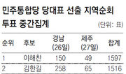 경남, 제주에서 잇달아 열린 민주통합당 지도부 선출 지역순회 경선 2연전에서 김한길 후보가 모두 1위를 기록했다.김 후보는 27일 제주 중소기업종합지원센터에서 열린 제주지역 대의원 투표에서 전체 312표(1인 2표) 중 65표를 얻었다. 이해찬 후보는 49표를 받아 추미애 후보(58표)에 이어 3위에 그쳤다. 제주는 대의원 수가 적지만 후보들의 직접적인 연고가 없는 중립지대여서 전반적인 표심을 가늠할 수 있는 바로미터로 여겨졌다.이에 앞서 26일 경남 창원시 창원문성대 체육관에서 열린 경남지역 대의원 투표에서도 김 후보는 전체 888표 중 258표를 얻어 1위를 차지했다. 이 후보는 150표로 2위였다.27일까지 광역시도 10곳에서 경선을 치른 결과 김 후보는 6승 4패로 이 후보를 이겼다. 울산 전남 대구 경북 경남 제주에선 김 후보가, 부산 광주 충남 대전에선 이 후보가 앞섰다. 경선 시작 전의 ‘이해찬 대세론’은 꺾였지만 누계 득표에선 고향 충남에서 몰표를 얻은 이 후보가 1597표로 김 후보(1516표)를 81표 앞서고 있다.특히 김 후보는 친노(친노무현) 지지세가 강한 영남 5곳 중에서 부산을 뺀 4곳에서 1위를 했다. 이는 ‘이해찬-박지원 연대’에 따른 비노(비노무현) 진영의 결집에 힘입은 바 크다. 경남에선 지역 영향력이 강한 김두관 경남지사의 ‘문재인 견제론’까지 가세한 것으로 보인다. 이 후보와 한배를 탄 것으로 의심받는 유력 대권주자인 문재인 상임고문을 의식해 김 지사가 김 후보를 지원했다는 것이다.경선이 엎치락뒤치락하자 두 후보 간 신경전도 날카로워졌다. 양승조 이해찬후보 선거대책위원회 총괄본부장은 27일 “김 지사가 당대표 경선을 본인의 대선 전초전쯤으로 생각하지 않는가 생각한다”며 김 지사와 김 후보 간의 연계 의혹을 제기했다. 그러나 김 후보는 “경남, 제주에서의 승리는 특정 후보에 편향되지 않은 공정한 대선 관리를 통한 정권교체를 바라는 당원·대의원의 명령”이라며 도리어 이 후보와 문 고문 간의 연계 의혹을 꼬집었다.이, 김 후보는 29일 세종·충북, 30일 강원, 31일 전북 경선에서도 혼전을 거듭할 가능성이 높다. 당대표 선출은 다음 달 5, 6일 당원 및 국민선거인단의 모바일 투표와 9일 전당대회에서 진행되는 수도권 대의원 투표 결과에 따라 결론이 날 것으로 전망된다. 선거 결과가 당원 및 국민선거인단 투표 70%, 대의원 투표 30%의 비율로 합산되는 데다 수도권에 대의원이 몰려 있어 후반전으로 갈수록 선거전이 치열해질 것으로 보인다.이유종 기자 pen@donga.com}