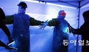 12일 대전 유성구 자운동 국군간호사관학교에서 교수진이 에볼라 바이러스를 가정한 형광물질이 보호복 탈의 과정에서 몸에 얼마나 묻었는지 확인하고 있다. 대전=최혁중 기자 sajinman@donga.com}