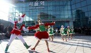 롯데월드 어드벤처가 다가오는 성탄절을 앞두고 18일 오후 서울역 광장에서 깜짝 크리스마스 공연을 선보이고 있다. 롯데월드 어드벤처는 해피 크리스마스 퍼레이드, 산타의 미라클 프레젠트 등 다양한 크리스마스 볼거리를 만날 수 있는 겨울 시즌 축제 '메이크 어 미라클 윈터'를 올해 말까지 진행한다.송은석기자 silverstone@donga.com}