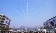 1일 전국 곳곳에서 3·1운동 100주년 기념행사가 열린 가운데 서울 광화문광장에서 정부 주최로 진행된 ‘함께 만든 100년, 함께 만드는 미래’ 행사에 공군 특수비행팀 ‘블랙이글스’가 축하비행을 하고 있다. 이날 행사에는 문재인 대통령 내외와 독립운동 유공자 등 시민 1만5000여 명이 참석했다. 양회성 기자 yohan@donga.com}