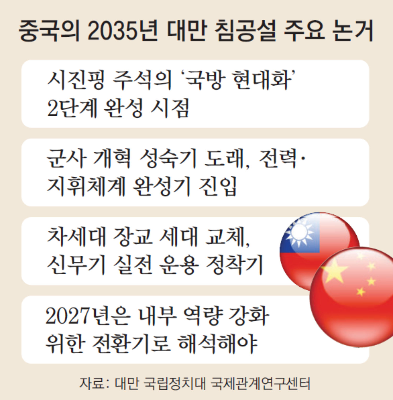10년 뒤인 2035년에 중국의 대만 침공 가능성이 높다는 대만 외교안보 전문가들의 분석이 제기됐다. 중국이 추진 중인 국방개혁이 마무리 돼 세부적인 침공 준비를 마치려면 그 정도의 시간이 필요하다는 것이다. 시진핑(習近平) 중국 국가주석의 임기가 끝나는 2027년 대만 침공 가능성이 높다는 미국 정보당국의 분석과는 차이가 있다.● “2035년 중국군 전력 성숙기 돌입”8일 대만중앙통신사에 따르면 이날 국립정치대 국제관계연구센터 주최로 열린 안보 좌담회에서 치러이(亓樂義) 국방안전연구원 연구위원은 “중국군의 대만 침공 고위험 시기는 2035년으로 봐야 한다”고 주장했다. 시 주석이 제시한 군 현대화 3단계 전략 중 두번째 단계가 완성되는 2035년에 군사 개혁의 성과가 성숙기에 접어들기 때문이라는 것이다.창군 100주년인 2027년까지 군 현대화 전환을 목표로 설정한 데 대해선 “외부 공격 준비보다는 내부 역량을 단련하기 위한 것”이라고 해석했다. 2027년까지 연합작전을 위한 지휘체계 전환과 신형 무기의 실전 운용 준비를 마치기 어려울 것으로 내다봤다.린잉유(林穎佑) 담강대 국제전략연구소 교수 역시 2017년 중국 군사학교 개편 후 육성된 장교들이 2035년경 현장 지휘관으로 진급하게 된다고 짚었다. 차세대 훈련을 받은 인재들이 핵심 간부진에 포진하는 2035년을 전력 완성기로 봐야 한다는 것. 전문가들은 최근 중국 공군이 대만 인근에서 벌이는 훈련이 질적으로 한층 고도화됐다고 분석했다. 마전쿤(馬振坤) 국방대 중공군사사무연구소 교수는 “심리적 교란을 목표로 한 회색지대 전술에서 실제 전투 준비 단계로 전환하고 있다”고 평가했다. 린 교수는 “과거 양으로 압도하는 전술을 쓰던 중국군이 질 중심의 새로운 위협을 가하고 있다”며 “공중과 해상 역량을 동시에 운용해 대만을 압박하려는 목적을 달성하고 있다”고 짚었다.마 교수에 따르면 지난 달 중국 공군의 훙-6 중장거리 폭격기가 대만해협 공역에서 활동한 날은 14일로 집계됐다. 마 교수는 “훙-6 폭격기가 대만섬 내 주요 표적을 정밀 타격하는 ‘외과 수술식’ 작전 능력을 강화하기 위한 훈련을 벌이는 것으로 추정된다”고 분석했다. 과거 서태평양이나 대만 남서쪽 공역에서 주로 포착되던 중국 폭격기가 대만해협 공역으로 활동 반경을 옮긴 점도 우려했다. ● 라이칭더 “中 군사훈련 인태지역 확대 주목해야”대만 전문가들의 분석은 올 8월 대만 국방부가 발표한 ‘중공 군사력 보고서’의 내용과도 일치한다. 대만 국방부는 중국군이 2035년까지 전면적 군사 현대화를 실현해 대만에 대한 봉쇄 전력 완비를 목표로 하고 있다고 분석했다. 또 현재 국제수역으로 간주되는 대만해협을 사실상 중국의 통제 범위 안에 두는 ‘내해화(內海化)’ 달성을 위해 제2도련선(일본 혼슈∼사이판∼괌∼인도네시아) 서쪽 전역에서 군사적 우위를 확보하려고 할 것으로 예상했다.라이칭더(賴淸德) 대만 총통은 7일 미국의 보수 성향 라디오 프로그램 ‘클레이 트래비스 앤드 벅 섹스턴 쇼’에 출연해 “(도널드 트럼프 대통령과 면담할 기회가 생긴다면) 시 주석이 대만해협을 비롯해 남중국해와 동중국해에서 군사 배치를 확대하고 있다는 사실에 주목할 것을 제안하고 싶다”고 말했다. 중국이 군사 훈련을 근해에서 인도태평양 지역으로 확대하고 있다는 것. 라이 총통은 “중국 항공모함이 제2도련선을 넘어 이동하고 있으며, 북방 함대는 일본 주변을 일주일 동안 항해하기도 했다”며 “트럼프 대통령이 시 주석에게 대만 침략을 영구적으로 포기하도록 설득한다면 노벨평화상 수상자가 될 것”이라고 했다. 이에 8일 중국 국무원 대만 담당 기구인 대만사무판공실의 천빈화(陳斌華) 대변인은 “그(라이)는 원칙 없는 외세 영합과 끝없는 ‘매국노’로 대만 국민의 피와 살을 탕진하고 자신을 매춘하며 외세에 몸을 맡겼다”고 원색적으로 비난했다.이지윤 기자 asap@donga.com}