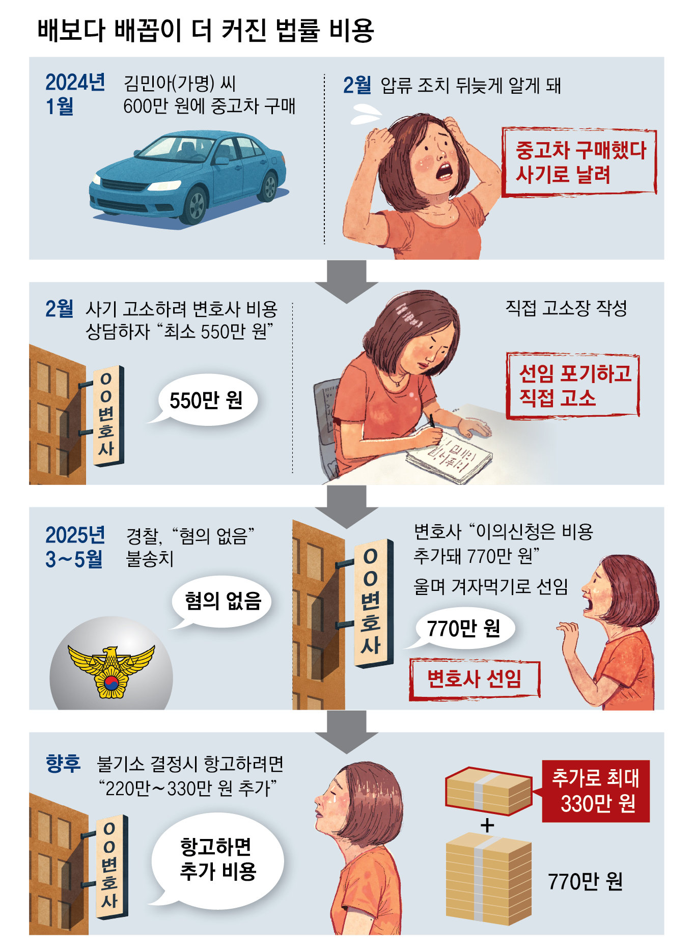 지방직 공무원 김민아(가명) 씨는 지난해 1월 중고차 거래 사기를 당했다. “해외로 나가야 해 급하게 차를 처분해야 한다”는 판매자 측 말만 믿고 시세보다 저렴한 가격인 600만 원에 차량을 샀다. 뒤늦게 자동차등록원부를 떼어 보니 압류·저당이 걸려 있었다. 결국 채권자인 금융사가 차량을 가져가면서 김 씨는 차량도 돈도 잃었다. ● ‘배보다 큰 배꼽’ 된 법률 비용 김 씨는 사기죄로 상대방을 고소하겠다고 마음먹었다. 문제는 비용이었다. 절박한 마음으로 찾아간 변호사 사무실에서 “고소대리는 부가세를 포함해 최소 550만 원부터 시작한다”고 안내받았다. 차량 가격에 맞먹는 변호사 비용이 부담스러웠던 김 씨는 어깨너머 배운 법률 지식을 바탕으로 직접 고소장을 작성했다. 역부족이었다. 올해 초 ‘증거 부족’으로 경찰에서 불송치 결정을 받은 것이다. 김 씨는 울며 겨자 먹기로 이의신청 제기를 위해 변호사 사무실을 찾았다가 다시 한번 깜짝 놀랐다. 기존에 제시한 착수금보다 220만 원 오른 770만 원을 수임료로 제시한 것이다. 변호사 측은 “경찰 수사 종결 이후 이의신청 건은 원래 별도 절차로 분류돼 추가 비용이 든다”며 “검찰이 불기소할 경우 항고할 수 있는데 그땐 220만∼330만 원을 추가로 내야 한다”고 설명했다. 결국 이의신청을 낸 김 씨는 “사기당한 돈을 찾으려고 고소한 건데 결국 차량값보다 변호사 비용을 더 쓴 꼴”이라며 “피해자에게 ‘웬만한 사기는 그냥 참으라’고 강요하는 것 아니냐”고 토로했다. ● 그물망처럼 변한 사법 절차에 피해자 부담 범죄 피해자들이 감당해야 할 법률 비용이 천정부지로 치솟고 있는 건 한층 복잡해진 형사사법 절차 때문이라는 분석이 나온다. 2021년 검경 수사권 조정 이후 수사 개시부터 종결에 이르기까지 이의신청과 보완 수사 등 1, 2차 수사기관 사이에서 오가는 절차가 한층 복잡해졌다. 이에 범죄 피해자는 1, 2차 수사기관이 어떻게 사건을 처리하는지, 어느 단계에서 어떻게 처리 결과에 이의를 제기해야 하는지 알기 어렵게 됐다. 형사 사건 전담 이민형 변호사는 “평생 수사기관에 한 번 갈까 말까 한 평범한 시민이 어느 날 갑자기 범죄에 연루됐을 때 혼자서 대응하기란 불가능에 가까운 게 현실”이라고 지적했다. 개별 계약으로 진행되는 탓에 변호사 선임 비용을 집계한 국가 통계는 없다. 하지만 법률구조공단에 따르면 2023년 9월부터 지난해 8월까지 민사 사건을 소송대리한 건수는 11만3178건으로 전년 같은 기간 대비 3.4% 늘었고, 소송가액은 7조9313억 원으로 40.5% 폭증했다. 형사사건 소송대리 건수 역시 1만4725건으로 5.5% 늘었다. 법조계 관계자는 “매년 소송 건수와 규모가 커지고 있는 탓에 개별 사건의 평균 비용 역시 늘어났을 가능성이 높다”고 했다. 수사 지연으로 인해 법률 비용이 늘어났을 것이라는 분석도 나온다. 검경 수사권 조정 이후 보완 수사 요구 사건은 지난해 10만 건을 넘어섰다. 지난해 검찰에 송치된 77만8294건 중 10만4674건(13.4%)이 보완 수사 요구 사건으로, 8건 중 1건이 다시 1차 수사기관으로 돌아가고 있는 셈이다. 조금이라도 나은 법률 서비스를 받으려면 비용을 추가로 지불해야 한다는 인식도 늘어가고 있다. 사업 거래처를 사기 혐의로 고소한 유철현(가명) 씨는 “보완 수사 요구 등으로 수사 기간이 늘어나면 변호사는 한 사건에 집중을 못 하게 돼 있다. 적절한 때에 격려금을 또 내야 한다”는 동료 사업가 말에 변호사 비용을 추가로 내야 하는지 고민 중이다. 이로 인해 변호사 업계에선 수사기관끼리 사건을 주고받게 될 때 추가로 청구하는 비용을 뜻하는 ‘핑퐁 수당’ 같은 은어까지 생겨났다. 한 형사 사건 전문 변호사는 “변호사 사무장들 사이에선 사건 신속 처리 명목으로 ‘급행료’를 받거나, 피고인에게 사건을 유리하게 종결시켜 주는 ‘사건 꺾기’, 전관 변호사를 서류상으로만 이름에 올리는 ‘표지 갈이’ 비용을 암암리에 별도로 받고 있다”며 “최근 형사사법 체계가 복잡해지면서 기본 수임료에 추가되는 비용도 천차만별로 달라지고 있다”고 지적했다. 지난달 12일 서울 서초구 서울지방변호사회에서 열린 ‘범죄 피해자가 바라는 검찰개혁 세미나’에서 안지희 변호사는 “현행 제도는 ‘검사의 사건 기록 재검토’를 법률 시장의 먹거리로 전락시켰고 그 피해는 범죄 피해자와 억울한 가해자(피고발인) 등 국민에게 전가되고 있는 실정”이라고 비판했다.● “적은 비용으로 신속 구제 가능해야” 검찰청이 폐지되는 내년 10월부터 중대범죄수사청과 공소청이 신설된다. 검찰청 한 곳에서 담당하던 업무가 2개 신설 부서로 쪼개지면서 각종 절차가 한층 복잡해질 것으로 법조계는 보고 있다. 이에 대응하기 위해 법률 비용도 더욱 늘어날 수 있다는 지적이 나온다. 대한변호사협회 대변인을 지낸 김원용 변호사는 “사건 불복 절차가 늘어날수록 수임료만으로 일괄 처리하기 어려워질 수 있다”고 말했다. 단계별 추가 비용이 발생할 수 있다는 의미다. 복잡해진 수사 절차 탓에 전관 비용만 늘어났다고 한다. 서초동의 한 변호사는 “예전엔 ‘검찰 전관 변호사’만