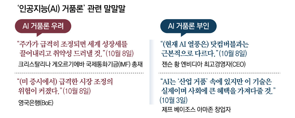 국제통화기금(IMF)과 영국 중앙은행인 영국은행이 8일(현지 시간) 동시에 이례적으로 미국 증시의 조정 가능성을 경고했다. 제롬 파월 미국 연방준비제도(Fed·연준) 의장이 지난달 “주가가 상당히 고평가됐다”고 진단한 데 이어 증시 과열을 우려하는 목소리가 커지고 있는 것이다. 주요 중앙은행과 IMF의 경고에도 미 주식시장에서 S&P500과 나스닥 지수는 같은 날 나란히 사상 최고치를 경신했다. 미 증시가 올해만 30번 넘게 신고가를 갈아치우자 2000년 닷컴버블 때와 비슷하다는 ‘AI 거품론’도 커지고 있다. 이에 맞서 지금의 AI발 투자 열풍은 과거 버블 때와는 근본적으로 다르다는 반론도 만만치 않다. ● 엔비디아, 사상 최고치로 마감8일 미국 뉴욕증시에서 나스닥 종합지수는 전 거래일 대비 1.12% 상승한 23,043.38, S&P500은 0.58% 오른 6,753.72로 마감했다. S&P500지수는 종가 기준으로 33번째, 나스닥은 32번째 사상 최고치를 경신했다.1일부터 미국 연방정부가 일시적 업무정지(셧다운)를 시작했지만 시장은 이를 심각하게 받아들이지 않았다. 과거 셧다운이 증시에 별다른 영향을 미치지 않았다는 경험이 축적됐기 때문으로 보인다. 시장은 오히려 AI 산업에 대한 기대에 민감하게 반응했다. 젠슨 황 엔비디아 최고경영자(CEO)가 이날 CNBC 인터뷰에서 “최근 6개월간 컴퓨팅 수요가 많이 증가했고, AI 관련 투자와 산업 수요가 예상보다 빠르게 확대되고 있다”고 밝힌 점이 호재로 작용했다.글로벌 시가총액 1위인 엔비디아는 전 거래일 대비 2.2% 상승한 주당 189.11달러로 종가 기준 사상 최고치를 갈아치웠다. 엔비디아의 경쟁자인 AMD의 주가도 11.37% 올랐다. 세계 최대 파운드리(반도체 위탁생산) 기업 대만 TSMC(+3.57%), 미국 메모리반도체 기업 마이크론(+5.84%)도 상승 마감했다.● AI 거품론 찬반 주장 팽팽연일 질주하는 AI발 미 증시 상승세에 25년 전 닷컴버블의 재연이라는 경계의 목소리도 나오는 분위기다. AI 산업화의 미래를 확실히 알 수 없는데 기대감만 높아져 투자금이 지나치게 몰렸다는 지적이다. S&P500 전체 시가총액의 3분의 1 이상을 차지한 알파벳(구글), 아마존, 메타 등 매그니피센트7(M7)이 모두 AI에 투자한 점도 위험 요소로 꼽힌다.이날 크리스탈리나 게오르기에바 IMF 총재는 미 워싱턴에서 열린 행사에서 “AI의 생산성 향상 잠재력에 대한 시장의 낙관적인 심리가 갑자기 뒤바뀔 수 있으며 그 충격이 세계 경제 전반에 충격을 줄 수 있다”며 “현재 주식시장 평가 가치는 25년 전 인터넷 붐 당시 수준에 근접하고 있다”고 말했다. 영국은행의 금융정책위원회도 이날 공개한 회의록에서 “(미 증시의 경기 순환 조정 주가수익비율은) 닷컴버블 정점기에 맞먹는 수준”이라며 “급격한 시장 조정의 위험이 커졌다”고 말했다.하지만 빅테크 수장들의 반론도 만만치 않다. 황 CEO는 ‘AI 거품론’에 대해 “지금 세상에서 벌어지고 있는 일과 2000년(닷컴버블 시기)에 일어났던 일은 근본적으로 다르다”며 “당시 인터넷 기업들을 다 합쳐봐야 시가총액이 300억∼400억 달러 정도에 불과했고, 현재 하이퍼스케일러 기업(초대형 클라우드, AI 기업)들은 이미 2조5000억 달러 규모의 실질적 비즈니스를 운영하고 있다”고 반박했다. 제프 베이조스 아마존 창업자도 최근 “지금의 AI 투자는 좋은 거품이고, 금융적 투기가 아니라 산업적 혁신을 이끄는 현상”이라고 주장했다.한재희 기자 hee@donga.com홍석호 기자 will@donga.com}