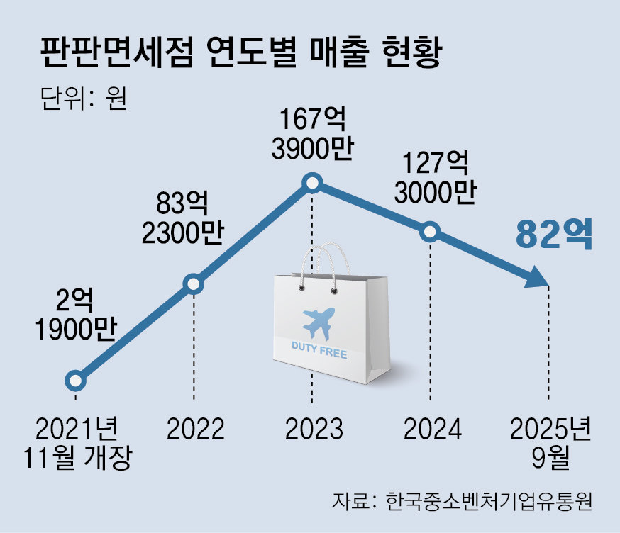 인천국제공항 내 중소기업 전용 면세점(판판면세점)이 개장 3년 만에 처음으로 역성장한 것으로 나타났다. 공항 터미널별 매출 편차와 구조적 입지 불리, 과도한 퇴출 기준이 맞물리면서 실적 부진이 심화되고 있다는 분석이다.22일 국회 산업통상자원중소벤처기업위원회 소속 허종식 더불어민주당 의원이 중소벤처기업부 산하 한국중소벤처기업유통원(한유원)으로부터 받은 자료에 따르면 지난해 판판면세점 매출은 127억3000만 원으로 전년(167억4000만 원) 대비 24% 감소했다. 이는 2021년 11월 판판면세점이 문을 연 이후 첫 역성장이다. 올해 9월 기준 누적 매출액은 전년 동기 대비 13억 원 감소한 82억 원으로 매출 하락세가 이어지고 있다. 판판면세점은 중소기업 제품의 해외 진출과 판로 개척을 지원하기 위해 만들어진 중기 전용 면세판매장이다. 인천에는 제1터미널(T1)과 제2터미널(T2)에 각각 2곳씩 총 4곳이 있다. 민간 대형 면세점 대비 낮은 수수료와 인력 지원 등의 혜택이 있다.부진한 실적은 터미널과 매장 위치에 따른 ‘매출양극화’가 영향을 미친 것으로 파악됐다. 수수료율은 동일한데 매장 위치에 따라 매출 차이가 큰 것으로 나타났다. T1 동편 매장은 올해 51억1100만 원의 매출을 내며 판판면세점 전체 매출의 62.3%를 차지했다. 반면 T2 동편 매장은 현재 위치로 확대 이전한 후 매출이 7억1800만 원으로 전년 동기(28억3100만 원) 대비 75%나 급감했다. 지난해 말 문을 연 T2 서편 매장도 월평균 매출이 7000만 원 수준에 그치는 등 부진을 면치 못하고 있다.이와 관련 한유원 측은 “2026년 1월 아시아나항공의 제2터미널 이전으로 유동 인구가 증가하면 실적이 개선될 것”이라고 설명했다. 그러나 매출 하락은 단순한 유동 인구 문제가 아니라 승객 동선을 고려하지 않은 ‘위치 선정 실패’가 핵심 원인이라는 지적이 나온다. 삼일PwC경영연구원은 최근 발간한 보고서에서 “공항 면세점 실적은 단순 유동 인구보다 동선, 매장 접근성, 브랜드 유치력 등이 중요한 변수”라고 분석했다. 특히 브랜드 인지도 확보가 어려운 중소기업 면세점은 위치에 따른 매출 영향이 더 크다는 진단이다.판판면세점의 퇴점 기준도 입점 업체들에게 부담으로 작용하고 있다. 한유원은 입점 기간(1년) 중 6개월 간 매출 실적이 하위 30%에 해당하는 업체를 퇴출 대상으로 지정하고 있다. 퇴점 업체는 2022년 53개에서 2024년 164개로 3배 이상으로 증가했다. 입지가 불리한 T2에 입점한 중소기업들의 매출이 적다보니 퇴출 가능성이 높아져 ‘기울어진 운동장’이라는 비판도 나오고 있다. 이런 상황에서 한유원은 내년 1월 T2에 현재 매장보다 큰 191㎡ 규모의 매장 2곳을 추가 개장할 계획이다. 허 의원은 “중소기업 판로 지원이라는 좋은 취지가 잘못된 입지 선정과 안일한 운영으로 퇴색되고 있다”며 “아시아나 이전에 막연히 기댈 것이 아니라 매장 위치 재조정과 마케팅 전략 수립 등 사업 전반을 원점에서 재설계할 필요가 있다”고 지적했다.남혜정 기자 namduck2@donga.com}