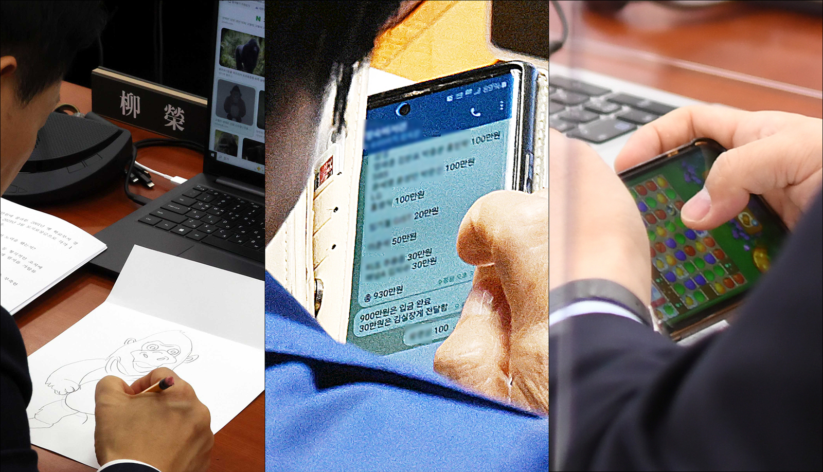 국정의 방향을 점검하는 가장 중요한 국정감사(국감)가 일부 의원들의 ‘딴짓’으로 얼룩지고 있다. 회의장에서는 정책 질의 대신 그림을 그리거나 모바일 게임을 하는 장면까지 포착돼 “국민 앞에서의 품위가 사라졌다”는 비판이 나온다.● ‘고릴라 스케치’ 논란 유영하 의원 “아무 의도 없었다”27일 독립언론 ‘미디어몽구’가 공개한 영상에 따르면, 국민의힘 유영하 의원은 국감 도중 노트북 화면에 띄운 고릴라 이미지를 따라 그리는 모습이 포착됐다. 당시 회의는 금융위원회와 금융감독원을 상대로 부동산 정책을 점검하던 자리였다.유 의원은 “고릴라를 그린 데는 아무 의도도 없었다. 그냥 한 번 그려보고 싶었다”며 “연필로 색칠하느라 몇 십 초 더 걸렸다”고 해명했다. 처음에는 “입장이 없다”고 했지만, 논란이 커지자 “명백한 실수이며 변명의 여지가 없다”고 SNS를 통해 사과했다.● “맛집 정리, 모바일 게임”…국감장서 반복되는 ‘딴짓’이 같은 ‘국감 중 딴짓’이 포착된 것은 이번이 처음이 아니다.작년 10월, 국회 방송통신위원회 국감에서는 신성범 국민의힘 의원이 동료 의원의 질의 도중 ‘맛집 리스트’를 작성하는 모습이 보여졌다. 누리꾼들 사이에서는 이 리스트의 제목인 ‘슴슴하지만 가슴…’이 화제가 돼 ‘국회의원도 가는 찐맛집’으로 알려지기도 했다. 당시 회의에서는 방통위원장의 불출석 문제로 여야가 충돌하고 있었다.2020년에는 더불어민주당 강훈식 의원이 산업통상자원중소벤처기업위원회 국감장에서 모바일 게임 ‘캔디크러쉬’를 하는 장면이 카메라에 잡혔다. 그는 “두말할 여지 없이 내 잘못”이라며 사과했지만, 2017년에도 같은 게임을 하다 적발된 바 있다.이 밖에도 2022년 권인숙 의원이 본회의장에서 체스 게임을 하다 사과했고, 2014년에는 새누리당 권성동 의원이 국감 중 비키니 사진을 보는 장면이 찍혀 논란이 됐다.● 딴짓이 ‘정치 생명’ 흔든 사례도국회 회의 중 사적 행동은 단순 해명으로 끝나지 않고 정치적 타격으로 이어지기도 했다.지난 26일 더불어민주당 최민희 의원은 본회의 도중 보좌진과 ‘딸 결혼식 축의금 명단’을 주고받는 문자가 포착됐다. 최 의원은 “논란 소지가 있는 일부 금액을 반환하려던 과정이었다”고 해명했다.2023년에는 김남국 의원이 국회 회의 중 가상화폐 거래를 한 사실이 드러나면서 윤리특별위원회로부터 ‘제명’ 요청을 받았다. 자문위는 김 의원이 상임위 및 소위 중 200회 이상 코인 거래를 한 것으로 확인했다.2022년에는 권성동 당시 국민의힘 원내대표가 대정부질문 도중 윤석열 대통령과 텔레그램 메시지를 주고받는 장면이 포착돼 “이유를 막론하고 심려를 끼쳐 죄송하다”고 사과했다.● 심할 경우 징계까지…”윤리 기준 강화 필요”현행 국회의원윤리실천규범 제2조는 “국회의원은 품위를 손상하는 행위를 해서는 안 된다”고 규정한다. 그러나 ‘품위 손상’의 기준이 모호해 실제 징계로 이어진 사례는 거의 없다.한양대 정치외교학과 김성수 교수는 “행위 자체만으로 징계하기는 어렵고, 정치 전략인지 단순 실수인지 구분하기도 애매하다”고 지적했다. 이어 “중요한 건 국민이 이런 사실을 알고 있는가”라며 “공식석상에서 딴짓을 하는 것은 국민을 무시하는 행위로 비칠 수 있다. 징계보다 더 무서운 건 국민의 투표이며, 언론이 꾸준히 감시해야 한다”고 강조했다.김영호 기자 rladudgh2349@donga.com}