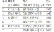건강보험 개혁안(오바마 케어) 시행을 둘러싼 버락 오바마 대통령의 연속된 사과는 미국 대통령의 역사적인 ‘7대 사과’ 안에 들 수 있을 것이라고 워싱턴포스트(WP)가 8일 인터넷 판에 보도했다. 대통령의 발언 장면을 담은 비디오와 함께 소개된 첫 번째 사례는 1961년 쿠바 피그 만 침공 실패 직후 나온 존 F 케네디 당시 대통령의 사과다. 워터게이트 사건(1977년)에 대한 리처드 닉슨 전 대통령의 사과와 ‘이란 콘트라 스캔들’에 대한 로널드 레이건 전 대통령의 사과(1987년)가 그 뒤를 이었다. 빌 클린턴 전 대통령은 1998년 르완다 인종 학살을 방치했다는 자성과 백악관 인턴 모니카 르윈스키와의 성 추문 사건 사과로 두 차례 이름을 올렸다. 오바마 대통령이 2009년 TV토크쇼에 출연해 자신의 시원찮은 볼링 실력을 설명하면서 지적 발달 장애 선수들이 참가하는 ‘스페셜 올림픽’을 비하했다가 사과한 사례도 소개됐다. WP는 또 오바마 대통령의 집권 2기 1년 차인 올해 지지율이 급락한 것은 전임자인 조지 W 부시 대통령과 닮은꼴이라고 보도했다. 퓨리서치 센터의 여론조사 결과 지난해 재선 직후인 12월 오바마 대통령의 직무 수행 만족도는 55%였으나 이달에는 41%까지 하락했다. 부시 대통령의 직무 만족도 역시 재선 직후인 2004년 12월 48%에서 2005년 11월 36%까지 떨어졌다. 이는 연임을 했던 레이건, 클린턴 전 대통령의 집권 2기 1년 차 지지율이 60%를 기준으로 오르내린 것과는 차이가 크다.워싱턴=신석호 특파원 kyle@donga.com}