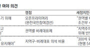 20대 총선이 8개월여 앞으로 다가왔지만 여야는 아직도 선거 룰을 정하지 못한 채 날선 공방을 벌이고 있다. 의원 정수 확대를 외친 새정치민주연합은 부정적 여론을 의식해 일단 의원 정수 문제를 접고 권역별 비례대표제 도입에 초점을 맞추고 있다. 새누리당 원유철 원내대표는 31일 기자들과 만난 자리에서 “권역별 비례대표제가 또 다른 지역구도의 측면이 강하다”며 “권역별 비례대표제를 도입하면 의원 정수를 늘릴 수밖에 없는 상황이다. 기본적으로 의원 정수를 늘리는 것에 대해 반대한다”고 말했다. 원 원내대표는 이날 원내대표단·정책위원회 연석회의에서도 “지금은 의원 정수를 늘리는 것이 중요한 것이 아니라 국회의 고비용 저효율 구조를 어떻게 바꾸느냐가 정치개혁의 핵심 과제”라며 “의원 수는 양보다 질이 중요하다”고 밝혔다. 권역별 비례대표제를 반대 여론이 많은 의원 정수 확대와 연결짓는 전략이다. 새누리당은 권역별 비례대표제 도입보다 공천제도 개혁이 시급하다고 주장한다. 4선의 정병국 의원은 라디오 인터뷰에서 “오픈프라이머리(완전국민참여경선)로 국민에게 공천권을 돌려주는 것이 정치개혁의 요체”라고 강조했다. 새누리당은 11일 의원총회를 열고 권역별 비례대표 도입, 의원 정수 확대에 대한 반대 당론을 확정할 계획이다. 반면 새정치연합 문재인 대표는 이날 최고위원회의에서 “정치에서 무엇보다 절실한 개혁 과제가 망국적인 지역주의 정치구도를 타파하는 것이고, 그 방안이 바로 권역별 비례제도”라고 맞섰다. 문 대표는 이어 “(권역별 비례대표제를 도입하면) 한 정당이 특정 지역의 정치를 독점하는 폐단을 막을 수 있다”며 “영남에서도, 호남에서도 경쟁하는 정치가 이뤄져 중앙정치와 지역정치 모두 건강하게 만든다”고 말했다. 하지만 의원 정수 확대에 대해선 언급을 피했다. 당 혁신위원인 조국 서울대 법학전문대학원 교수도 이날 자신의 트위터에 올린 글에서 “새누리당의 권역별 비례대표 반대의 진짜 이유는 50% 이하 득표로 과반(을) 차지하는 혜택이 사라지기 때문”이라고 주장했다.고성호 기자 sungho@donga.com}