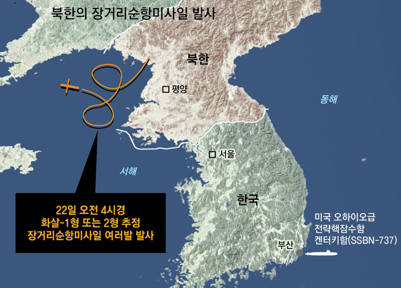 북한이 22일 새벽 서해상으로 ‘북한판 토마호크’로 추정되는 장거리순항미사일 여러 발을 쐈다. 미군의 전략핵잠수함 켄터키함(SSBN-737) 부산항 입항이 핵무기 사용 조건에 해당한다고 위협한 지 이틀 만이다. 앞서 19일 새벽에 ‘북한판 이스칸데르(KN-23)’가 유력한 단거리탄도미사일(SRBM)을 동해상으로 발사한 지 사흘 만에 또다시 새벽 취약 시간대를 골라 기습 핵타격 위협을 한 것으로 군은 보고 있다. 북한이 ‘전승절’이라고 주장하는 정전협정일(27일)에 대규모 열병식 임박 징후도 속속 포착돼 한미 당국이 주시 중이다.● 韓·주일미군 겨냥 모의 핵타격 시험한 듯 23일 군에 따르면 22일 오전 4시경부터 북한 내륙 지역에서 서해상으로 여러 발의 순항미사일이 발사됐다. 한미 당국은 위성과 조기경보통제기 등에 포착된 세부 비행 제원을 분석하고 있다. 군 소식통은 “‘북한판 토마호크’로 불리는 화살-1형 또는 2형 3∼4발가량을 쏜 것으로 보인다”고 말했다. 북한은 올 3월 22일 함경남도 함흥 일대에서 모형 핵탄두를 탑재한 화살-1형과 2형을 2발씩 총 4발 발사해 600m ‘초저고도’ 상공에서 공중 폭발시키는 시험을 했다고 주장한 바 있다. 또 동해에 설정된 1500km와 1800km 거리를 타원 및 ‘8자형’ 궤도를 따라 비행한 뒤 목표에 명중했다고도 했다. 이번에도 같은 방식의 테스트를 했을 가능성이 있다. 순항미사일의 비행 속도는 음속(시속 약 1224km)에는 못 미치지만 수십∼수백 m 초저고도로 궤도를 이리저리 바꿔 비행해 레이더 등으로 탐지 및 추적이 힘들다. 화살-1·2형의 사거리(최대 2000km)에는 한국과 일본 전역이 포함된다. 군 당국자는 “한반도 전역과 미 증원전력이 배치된 주일미군 기지를 언제든 핵으로 때릴 수 있다고 협박한 것”이라고 말했다. 19일 KN-23을 평양 순안에서 켄터키함이 입항한 부산 남구 해군작전기지까지의 사거리에 맞춰 동해로 쏜 뒤 순항미사일까지 무력 시위에 동원한 것은 미사일 종류에 상관없이 전술핵으로 미국의 확장억제 전력을 공격할 수 있다고 위협한 것이다. 군 관계자는 “강순남 북한 국방상이 20일 SSBN 기항 등 미 전략자산 전개의 가시성 증대가 ‘핵무기 사용 조건’에 해당한다고 위협한 직후에 순항미사일로 한국 내 주요 표적과 주일미군 기지 등에 대한 동시 다발적 모의 핵 공격 시험을 한 것으로 보인다”고 말했다. 한미 핵협의그룹(NCG) 출범과 SSBN 입항 등 한미의 확장억제 강화에 맞서 북한은 ‘맞불 도발’을 이어갈 것으로 예상된다. 전승절(27일) 전후로 핵무력 고도화를 과시하는 추가 도발이나 무력 시위 가능성이 크다고 보고 군은 대북 감시태세에 만전을 기하고 있다. ● 대형 부교 설치 등 열병식 임박 징후 이런 가운데 21일(현지 시간) 미국의소리(VOA) 방송에 따르면 평양 김일성광장 앞과 대동강 건너편을 잇는 대형 부교 2개가 설치된 모습이 민간위성이 20일 촬영한 사진에서 포착됐다. 북한은 지난해 4월과 올 2월에도 열병식 일주일 전 같은 위치에 대형 부교를 설치한 바 있다. 부교에는 폭죽과 조명 시설 등이 설치된 것으로 알려졌다고 VOA는 전했다. 한미는 전승절 기념 열병식이 임박했다는 징후로 보고 있다. 앞서 올 2월 건군절 75주년 열병식에서 화성-18형 고체연료 대륙간탄도미사일(ICBM)을 첫 공개한 북한이 이번 열병식에서도 새로운 전략무기를 등장시킬지 주목된다. 북한은 정주년(5·10년 단위로 꺾어지는 해) 열병식에서 핵·미사일 고도화를 과시하는 새 무기를 공개해 왔다.윤상호 군사전문기자 ysh1005@donga.com}