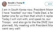 도널드 트럼프 미국 대통령이 30일 비무장지대(DMZ) 방문 은 오래 전부터 계획한 것이었음을 밝혔다.방한 이틀째인 트럼프 대통령은 이날 트위터에 "나는 지금 한국에 있다"며 "오늘 나는 우리의 부대를 방문해 그들과 이야기할 것이다. 그리고 DMZ에도 간다(오랫동안 계획된)"이라고 썼다.이 트윗은 이번 DMZ 방문이 즉흥적 제안이 아니었음을 강조한 것으로 보인다.트럼프 대통령은 또 전날 청와대 상춘재에서 진행된 만찬과 관련, "문 대통령과 나는 우리의 새로운 무역 협정을 위해 건배했는데, 이전 것 보다 훨씬 더 좋은 것"이라며 "문 대통령과의 만남은 매우 잘 진행됐다"고 적었다.이는 한미 FTA(자유무역협정) 개정안을 언급한 것으로 보인다.트럼프 대통령은 전날 트윗을 통해 DMZ에서 김정은 북한 국무위원장과 만나고 싶다고 '깜짝 만남'을 제안했다. 북측도 최선희 외무성 제1부상의 담화를 통해 긍정적 입장을 밝힌 상황이어서 성사 여부가 주목된다.박태근 동아닷컴 기자 ptk@donga.com}