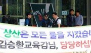 전북 전주 상산고의 자율형 사립고 지정 취소가 결정된 20일 전북도교육청 철통 경계를 하고 있다. 전북도교육청은 이날 오전부터 경찰까지 동원해 정문을 통제하고 있으며 교육청 직원들을 동원해 모든 출입문과 계단을 봉쇄했다. 또 경찰에 시설보호 요청을 한 상태며 이로 인해 경찰인력 222명이 투입돼 도교육청을 둘러싸고 있다.이를 지켜본 학부모들과 시민들은 과잉대응이라며 불만을 표출했다.상산고의 한 학부모는 “우리를 범죄자 취급하는 느낌이다”며 “교육청은 누구나 출입할 수 있는 곳인데 통제하는 것은 도교육청의 과잉대응이다”고 말했다.전북도교육청 인근에 사는 박모씨(42)는 “경찰 인력이 많아 큰 사건이 벌어진 줄 알았다”며 “학부모들이 모여 있을 뿐인데 교육청이 과도하게 경비를 하고 있는 것 같다”고 말했다.이에 대해 교육청 관계자는 “많은 학부모들이 모일 수 있어 경찰에 시설보호 요청을 했다”며 “혹시나 발생할 수 있는 상황에 대비했을 뿐이다”고 말했다.전북도교육청은 이날 청사에서 기자회견을 열고 "자체평가단 평가와 심의 등을 거쳐 상산고에 대해 자사고 지정 취소 결정을 내렸다"고 설명했다.박삼옥 상산고 교장은 기자회견을 갖고 “전북교육청의 자사고 평가결과 발표내용이 형평성, 공정성과 적법성에 크게 어긋남에 따라 이를 전면 거부함과 동시에 그 부당성을 바로 잡기 위한 투쟁을 강력히 펼쳐나갈 것”이라고 말했다.박태근 동아닷컴 기자 ptk@donga.com}